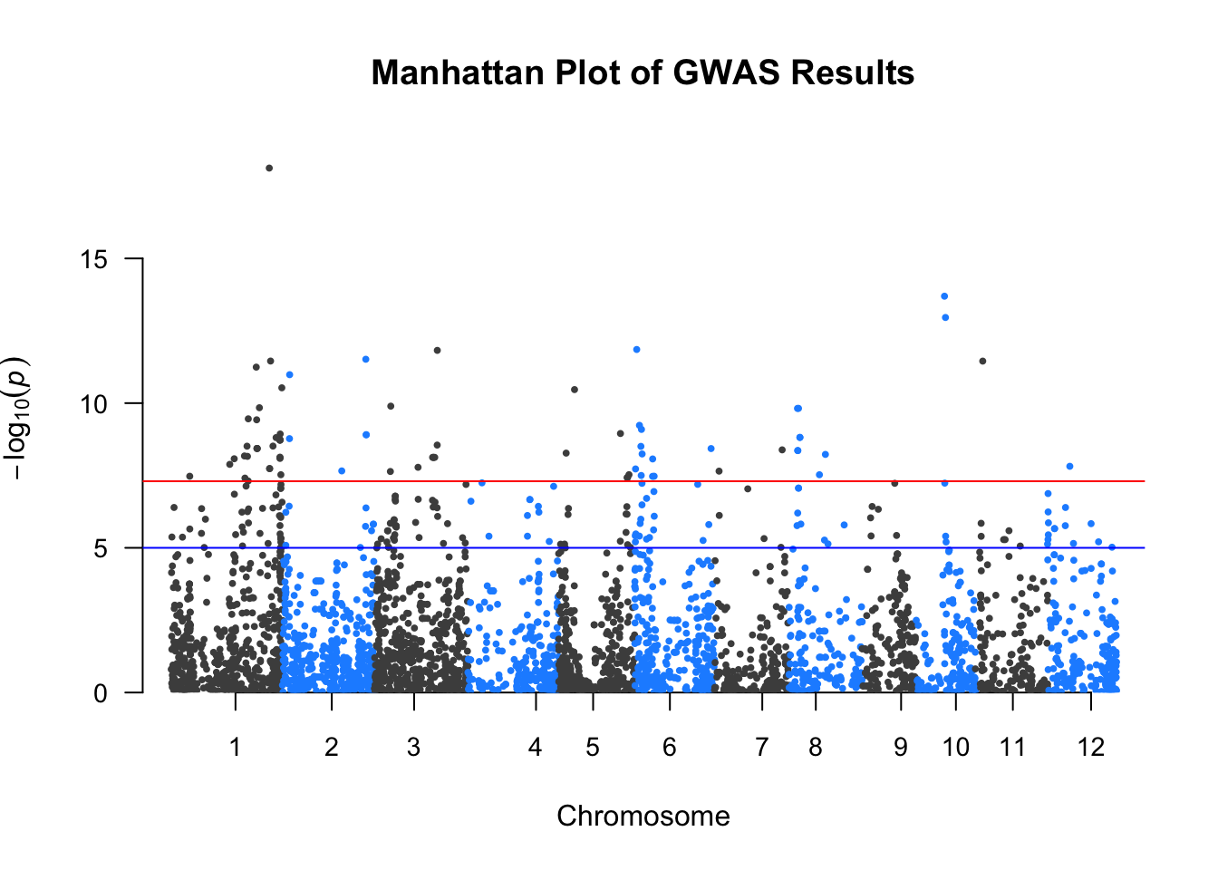 The qqman package provides a convenient way to create Manhattan plots directly from GWAS result tables. A Manhattan plot displays each SNP’s –log10(p-value) along its genomic position, helping identify regions with strong associations.
