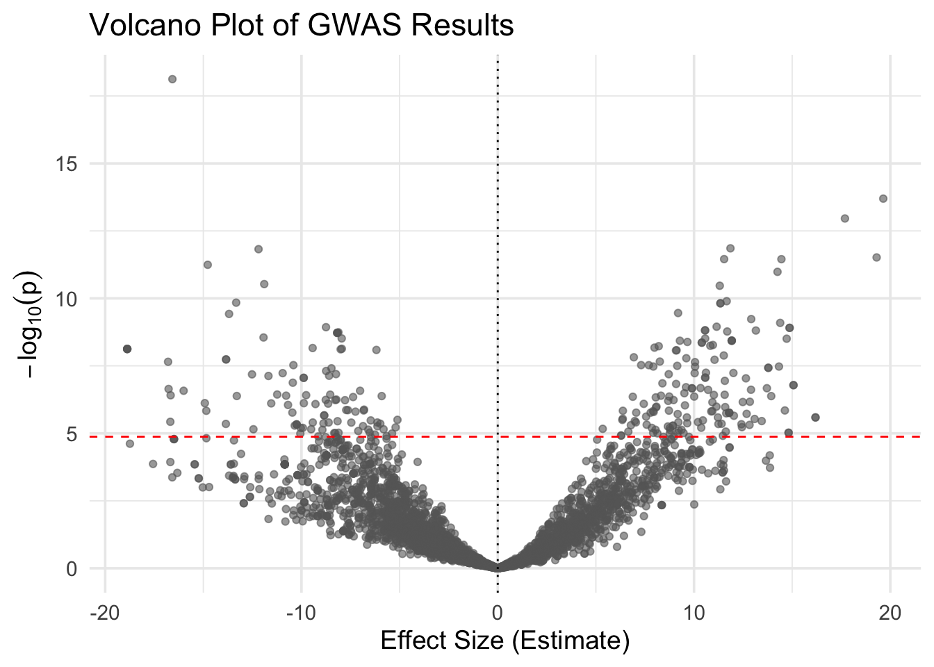 ✅ Takeaway: A volcano plot shows the balance between effect size and significance. SNPs with both large effects and low p-values appear as extreme points in the top left or right quadrants.
