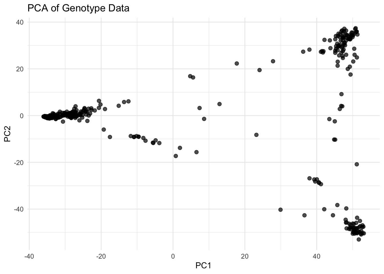 labs(title = "PCA of Genotype Data", x = "PC1", y = "PC2") +